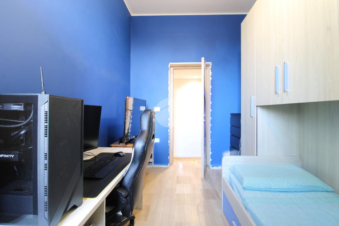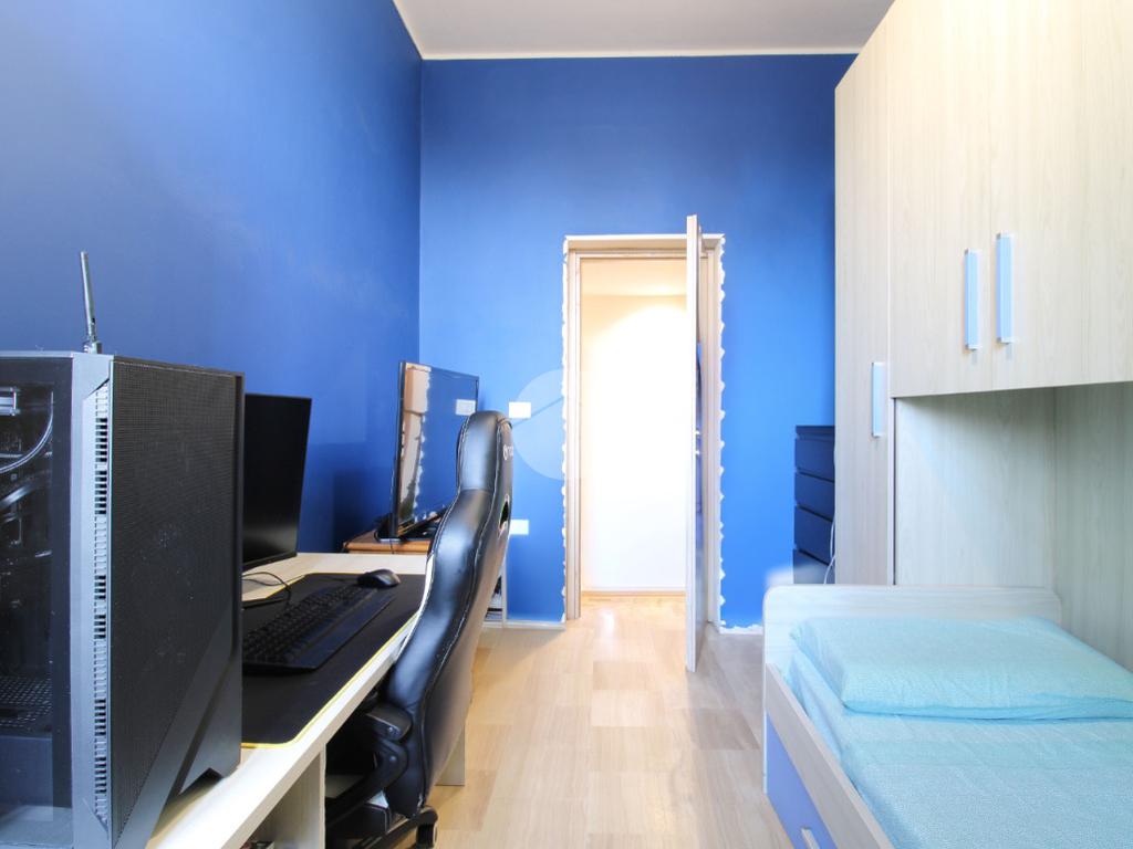 Un pratico disimpegno conduce alla zona notte composta da camera matrimoniale, cameretta e bagno finestrato con box doccia, ambienti ben distribuiti e pensati per garantire privacy e funzionalità.